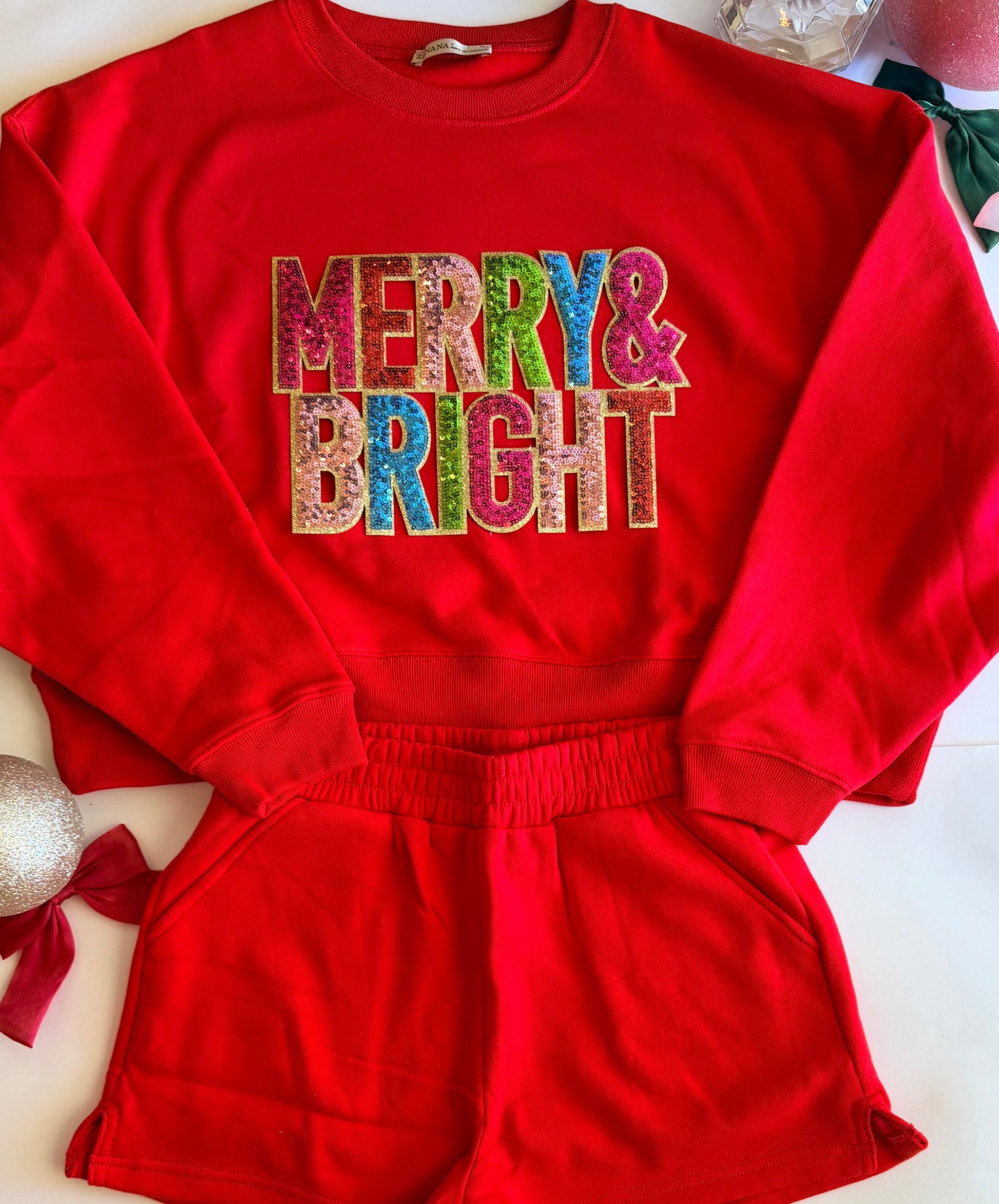 Adult Christmas Red Sweatshirt + Short Set with Single Sequin Patch